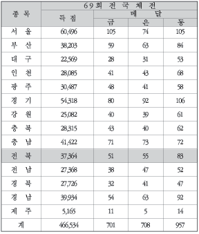 체조의 석수광(전북대)이 평행봉과 마루운동, 개인종합 1위, 단체우승 등 4관왕이 됐다. 국가대표 박지숙도 평행봉과 뜀틀, 개인종합에서 각각 1위 3관왕이 돼 전북체조가 종합우승, 88 체전의 값진 수확이었다.