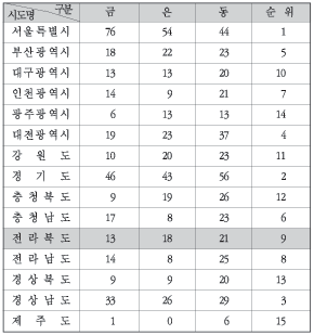 금 13, 은 18, 동 21개가 올 전북의 메달 성적표, 15개 시도중 비공식 메달순위 9위에