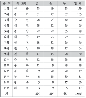 전반적인 침체속에 특히 종목별 우열의 차가 크게 나타났다. 전북이 획득한 금메달 절반이 넘는
